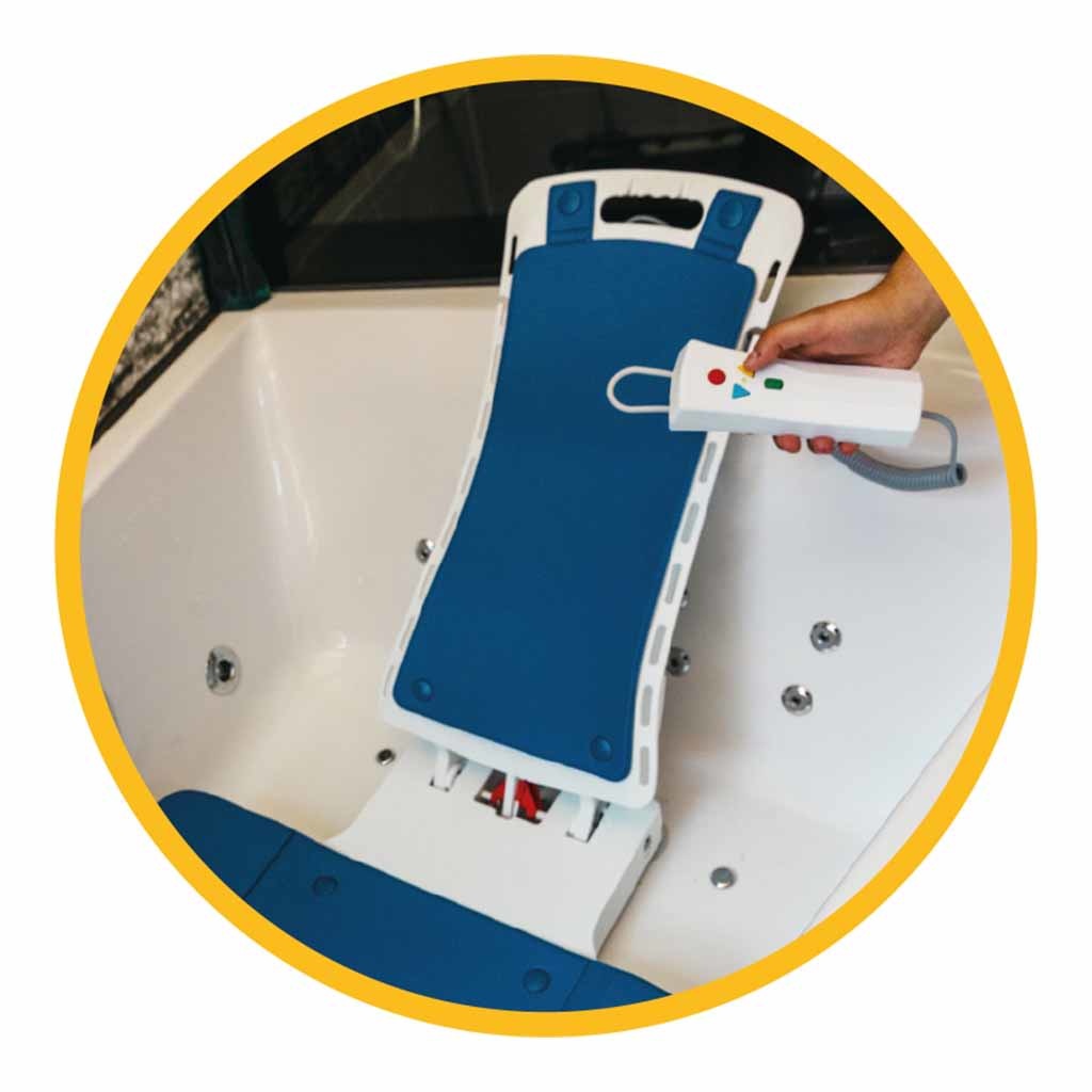 Badlift Bellavita Nova is eenvoudig in gebruik. Wanneer u in bad wilt stappen zet u de lift in de bovenste positie door middel van de afstandsbediening, de zijvlakken vallen dan over de badrand zodat u makkelijk kunt gaan zitten. Wanneer u vervolgens de badlift laat zakken zullen de zijflappen naar binnen klappen tegen de binnenkant van het bad. De waterbestendige afstandsbediening is voorzien van gekleurde knoppen zodat ook voor degene met een slechter zicht deze goed te gebruiken is. Verder heeft deze badlift een ergonomische zitting en rugleuning voor meer comfort tijdens het nemen van een bad.