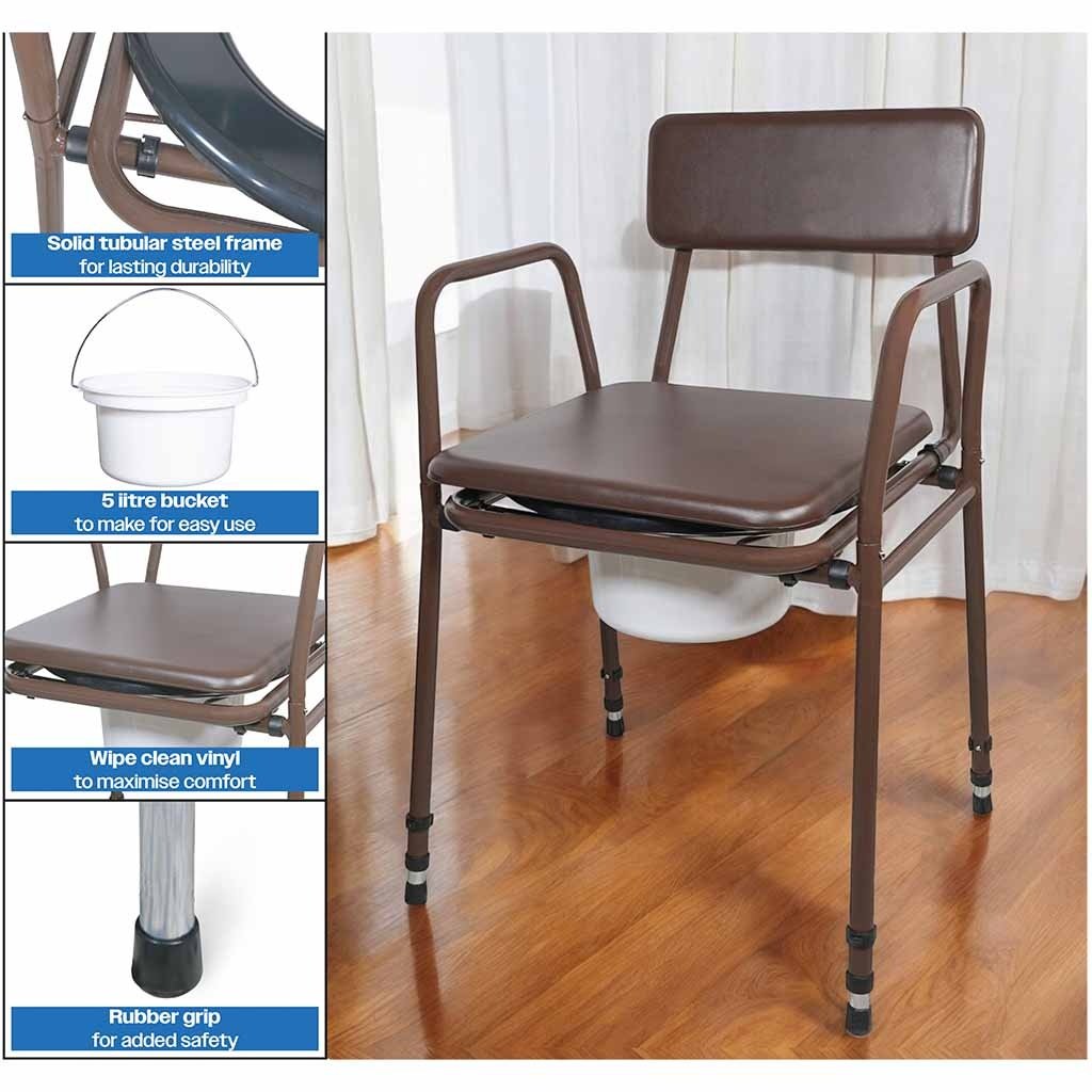 Deze verstelbare toiletstoel biedt u een comfortabele en praktische oplossing wanneer u extra ondersteuning nodig heeft bij het toiletgebruik. Dankzij het in hoogte verstelbare ontwerp en de stevige constructie past u deze toiletstoel eenvoudig aan uw persoonlijke situatie aan. Ideaal voor gebruik in de slaapkamer, badkamer of als extra ondersteuning in huis. De verstelbare poten zorgen ervoor dat u de zithoogte eenvoudig aanpast aan uw lengte en voorkeur. Met vijf verschillende standen kiest u altijd een comfortabele en veilige zithouding, wat het opstaan en gaan zitten aanzienlijk vergemakkelijkt. Het sterke stalen frame met krasbestendige afwerking biedt langdurige stabiliteit en ondersteuning. Met een maximaal gebruikersgewicht van 180 kg is deze toiletstoel geschikt voor een brede doelgroep en voelt hij veilig en solide aan. De toiletstoel is voorzien van een zachte rugleuning en armleuningen, die extra ondersteuning bieden tijdens het zitten en opstaan. De armleuningen zijn bovendien afneembaar, wat het eenvoudiger maakt om vanaf de zijkant over te stappen. De uitneembare emmer van 5 liter met deksel en handvat maakt het legen en reinigen eenvoudig en hygiënisch. De gladde oppervlakken zijn gemakkelijk schoon te maken, wat zorgt voor een frisse en verzorgde omgeving. Dankzij de afdekzitting is de toiletfunctie netjes uit het zicht wanneer de stoel niet wordt gebruikt. Hierdoor past deze toiletstoel ook goed in woon- of slaapruimtes zonder direct op te vallen. Met een gewicht van slechts 6,8 kg is deze lichtgewicht toiletstoel eenvoudig te verplaatsen tussen verschillende ruimtes. Ideaal als u flexibiliteit nodig heeft in huis of in een zorgomgeving. Ja, de toiletstoel verstelbaar is voorzien van vijf hoogtestanden (50-59 cm) die eenvoudig zonder gereedschap in te stellen zijn. De toiletstoel heeft een maximaal gebruikersgewicht van 180 kg. Ja, de toiletstoel wordt geleverd inclusief emmer, deksel en zitting, en is eenvoudig te monteren zonder gereedschap. Ja, de armleuningen zijn afneembaar, wat het makkelijker maakt om vanaf de zijkant plaats te nemen.