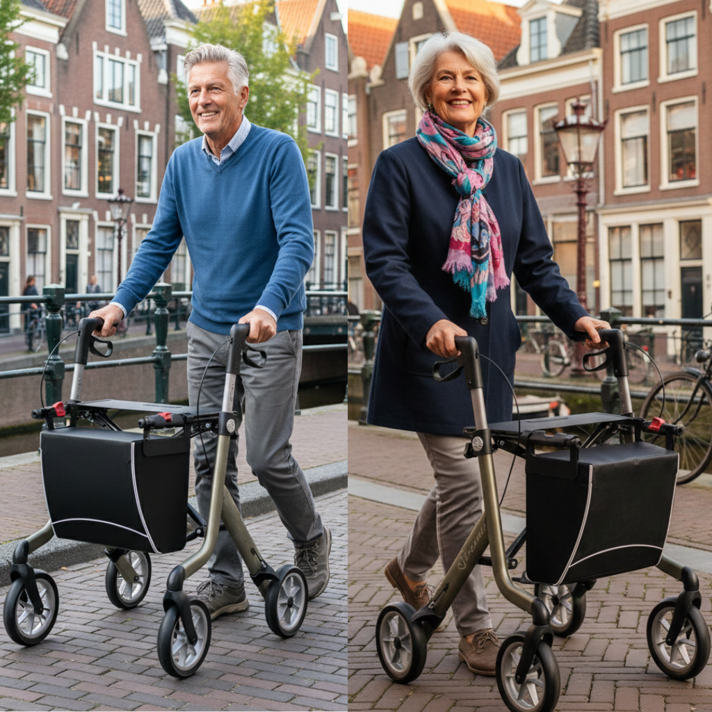 Deze inklapbare rollator combineert een modern ontwerp met praktisch gebruiksgemak. De boodschappentas met magneetsluiting, ergonomische handvatten en deels weggewerkte remkabels zorgen voor een veilige, prettige en verzorgde wandelervaring.