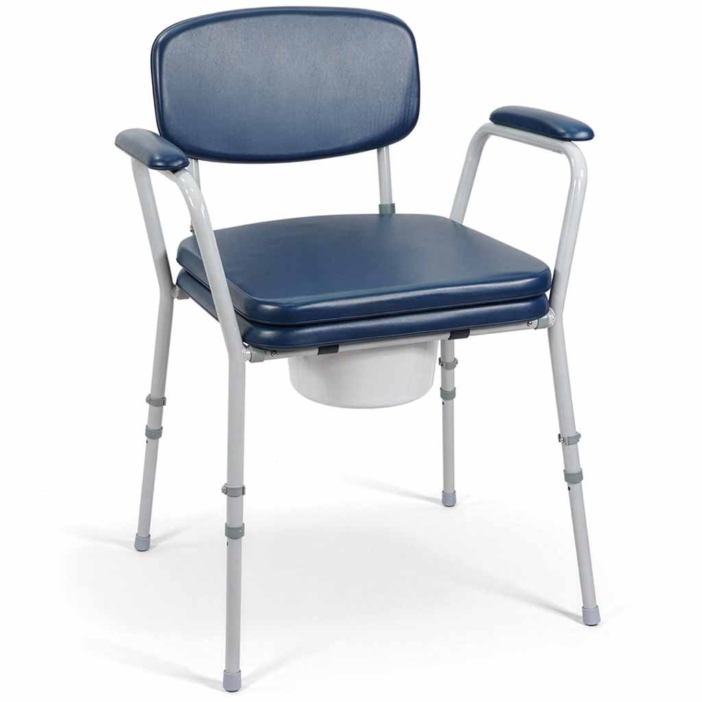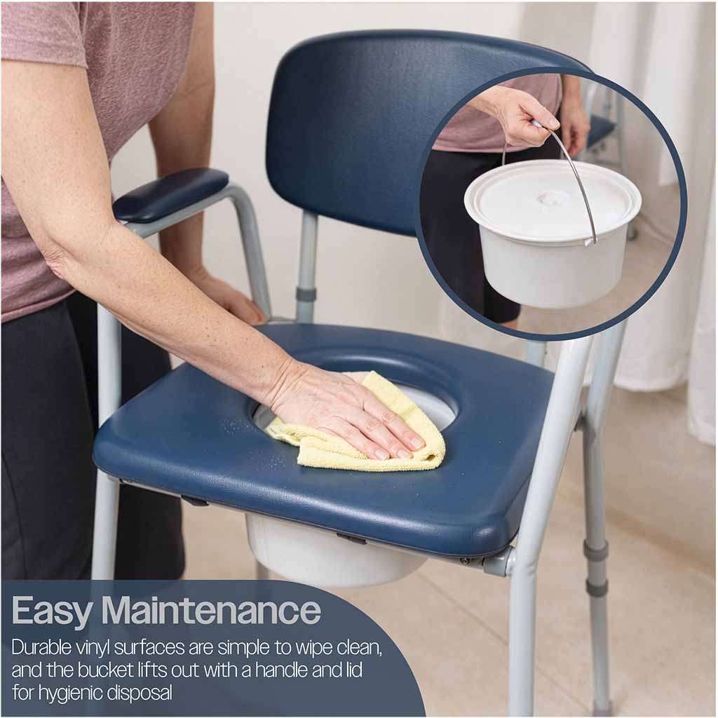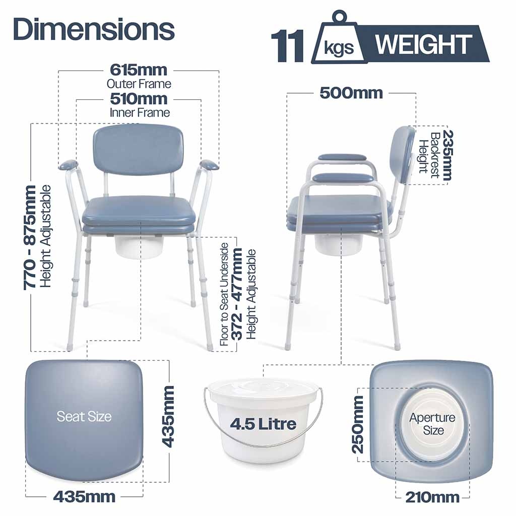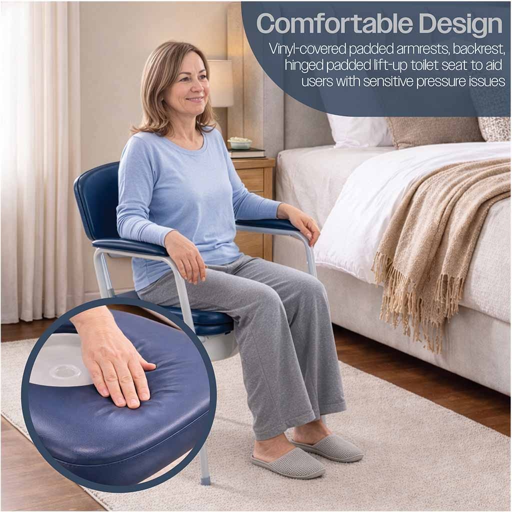De Toiletstoel met Zachte Armleuningen en Rugleuning biedt u een comfortabele en praktische oplossing wanneer het lastig is om regelmatig naar het toilet te lopen. Dankzij de gevoerde armleuningen, rugleuning en zachte toiletzitting zit u comfortabel en krijgt u extra ondersteuning bij het gaan zitten en opstaan. Deze toiletstoel voor naast het bed is ontworpen voor veilig en discreet gebruik in huis of in een zorgomgeving. De stoel is voorzien van verstelbare poten zodat u de zithoogte eenvoudig kunt aanpassen aan uw persoonlijke voorkeur. Het stevige frame ondersteunt gebruikers tot 127 kg, terwijl de antislip voeten zorgen voor extra stabiliteit. Dankzij de meegeleverde toiletemmer met deksel en de praktische overzitting is deze toiletstoel zowel hygiënisch als discreet in gebruik. Deze toiletstoel is ontworpen met extra aandacht voor comfort. De vinyl gevoerde armleuningen en rugleuning bieden aangename ondersteuning wanneer u zit of opstaat. Ook de zachte opklapbare toiletzitting draagt bij aan een comfortabel gevoel tijdens gebruik, wat vooral prettig is wanneer u gevoelig bent voor druk op het lichaam. Wanneer de stoel niet als toilet wordt gebruikt, kunt u de meegeleverde overzitting plaatsen. Hierdoor oogt de stoel als een normale stoel en blijft hij netjes en discreet in de ruimte staan. Dit maakt de stoel ideaal voor gebruik in de slaapkamer of woonkamer, zowel overdag als ’s nachts. De vinyl oppervlakken zijn duurzaam en eenvoudig schoon te maken met een vochtige doek. De uitneembare toiletemmer met handvat en deksel kan gemakkelijk worden verwijderd voor hygiënisch legen en reinigen. Hierdoor blijft de toiletstoel praktisch en gemakkelijk in onderhoud. De toiletstoel is eenvoudig te monteren zonder gereedschap. Dankzij de in hoogte verstelbare poten (37,2-47,7 cm) kunt u de zithoogte aanpassen voor een comfortabele en veilige zithouding. Dit maakt de stoel geschikt voor verschillende gebruikers en situaties. Het stevige frame van deze po-stoel ondersteunt een maximaal gebruikersgewicht van 127 kg. De antislip doppen onder de poten zorgen ervoor dat de stoel stevig blijft staan op verschillende vloertypen. Hierdoor kunt u de stoel met vertrouwen gebruiken, zowel overdag als ’s nachts.Belangrijke kenmerken