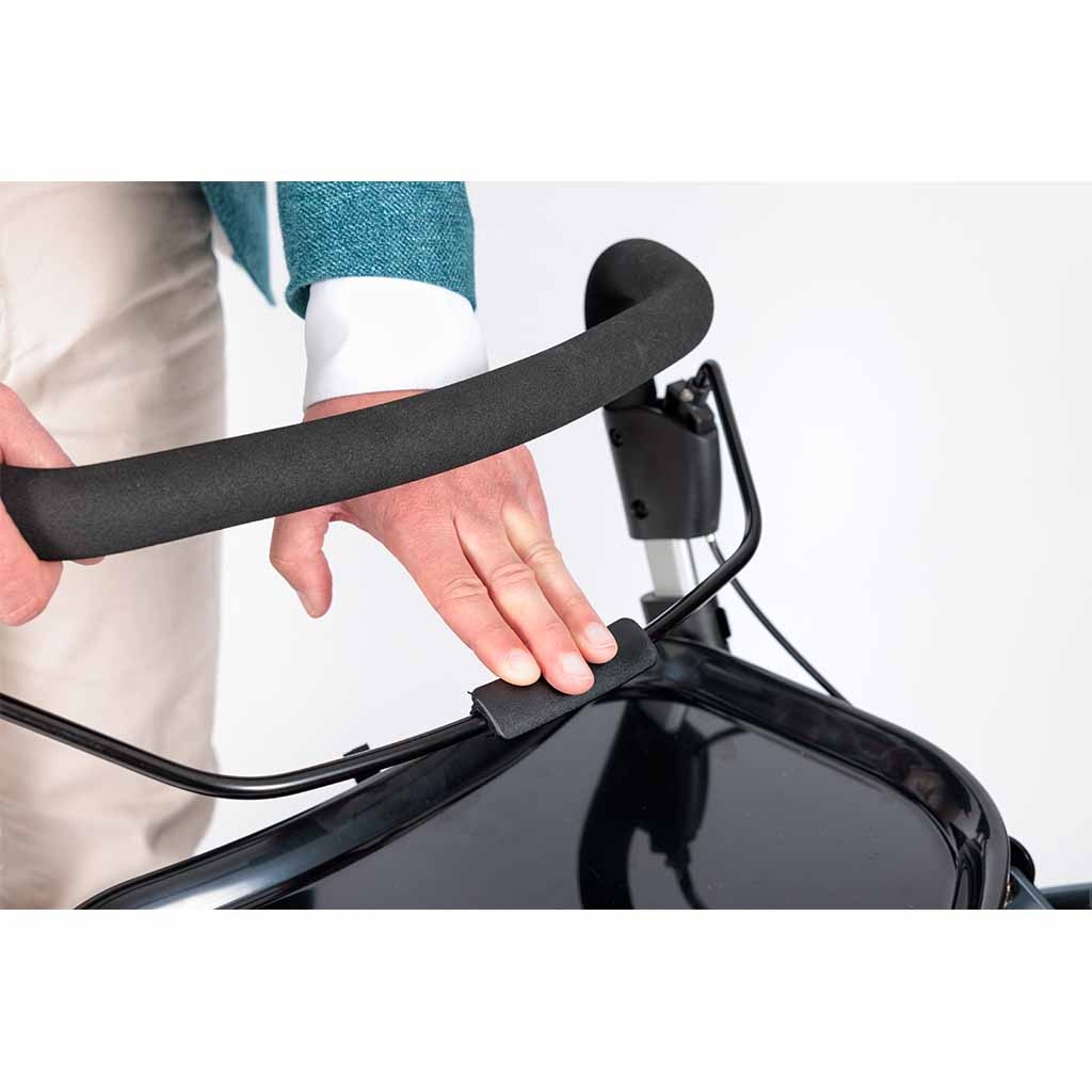 De parkeerrem is vernieuwd en nog gebruiksvriendelijker. U hoeft enkel de beugel naar beneden te drukken om de rollator veilig vast te zetten – ideaal voor snel en moeiteloos gebruik.